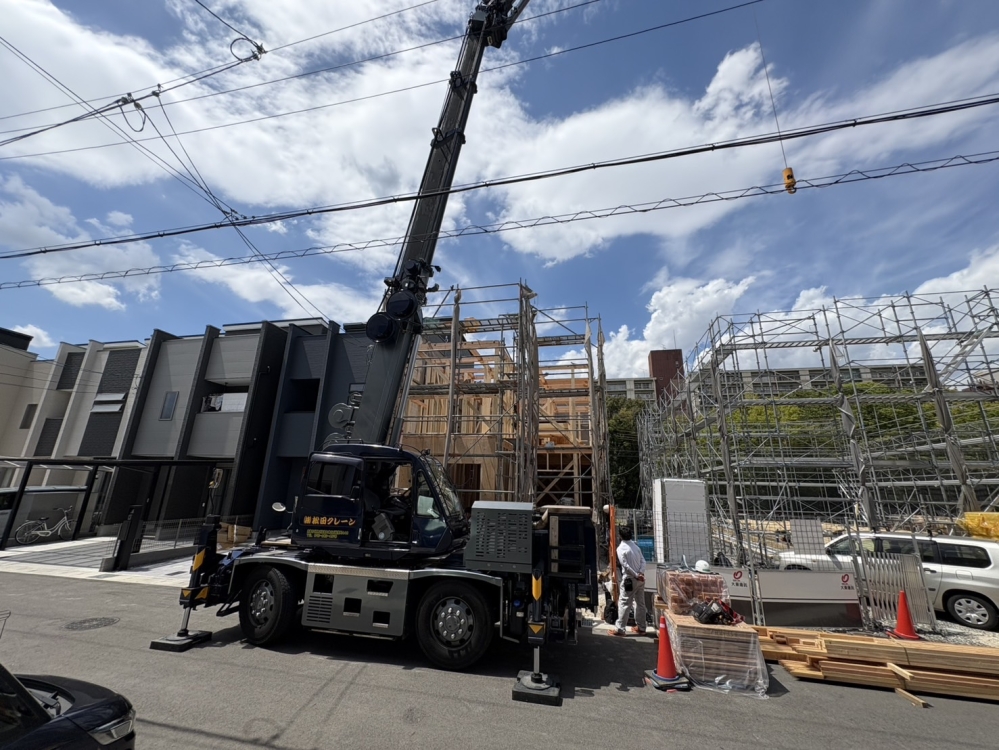 上棟の日は、大型のレッカー車両やたくさんの大工職人さんが集まり、一斉に工事が進められます!