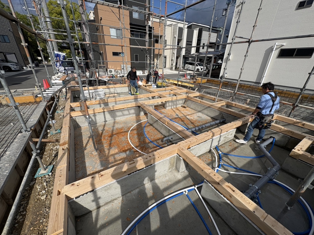 ヴェル・ディアコート向島セントラルパーク13号地、上棟前の土台敷工事の様子です!